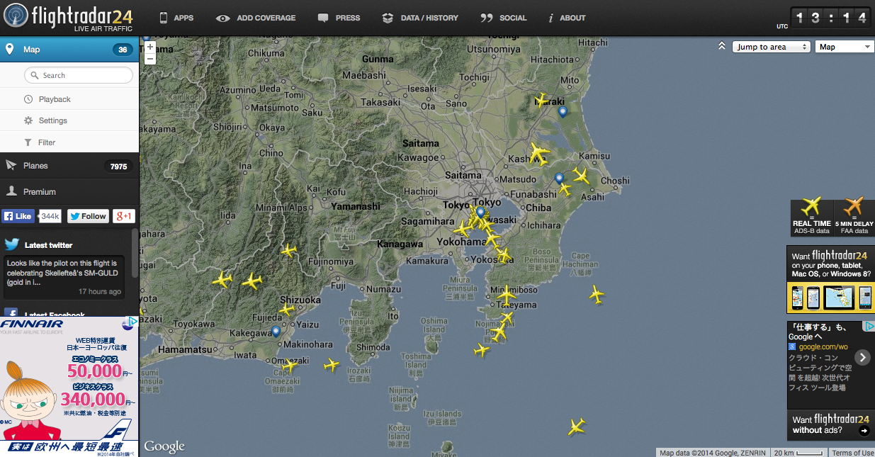 ちょっと古い話になりますが、このサイト見てて飽きないんです。なぜなら今上空を飛んでいる飛行機がリアルタイムでPCブラウザで見れるんです!いやーすごいですね〜。リアルタイムだからギューン!って飛んでるのがわかるし、飛行機にマウスオーバすると飛行機の便IDが見れるし便利ね〜。更に今は無料のiPhoneアプリだってある始末。300円の有料版もあるけど、まずは無料版でもいいと思います。