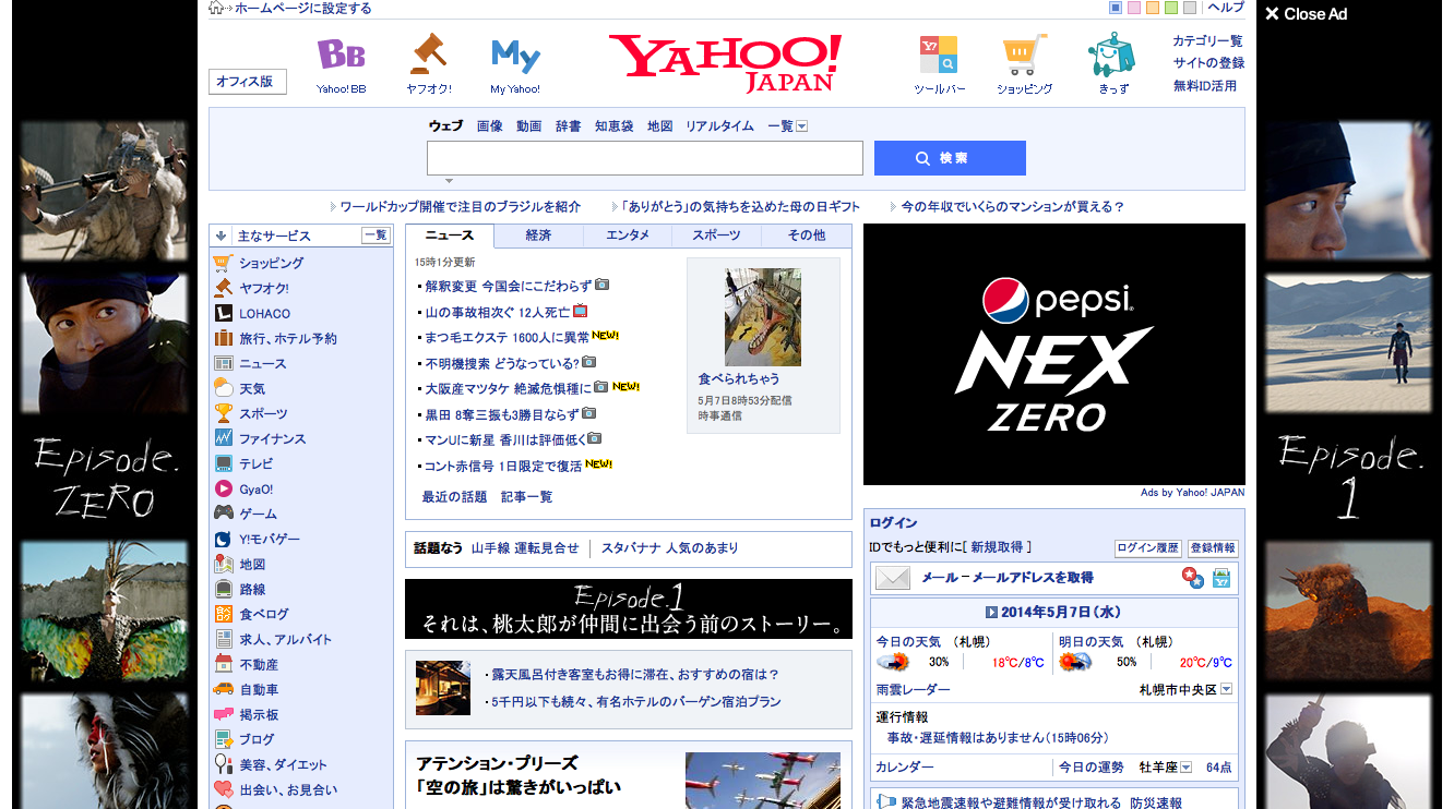 Yahooの広告が1面pepsiの広告になりました。実際CMを事前に宣伝するというちょっと面白いプロモーションですね。内容としては以前ブログでエントリーした ペプシネックスのCMがカッコよすぎてワロス のですが、この桃太郎が仲間と会う前のEpisode1と題した内容となっている。CM自体は5月10/11日となっており、かなり期待出来る内容かと思える。
