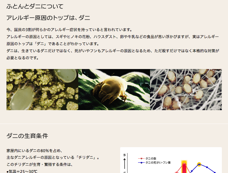 こんなダニちゃんの写真と文言があると本当恐怖を抱いちゃいますよね。実際ハウスダストアレルギーの方って結構いるんじゃないでしょうか。よく小さいなお子さんは多いし大人も沢山いると思います。更に『ダニ自体は布団に数千匹の死骸と共に寝ている』と言われれば誰だって恐怖を抱きます。