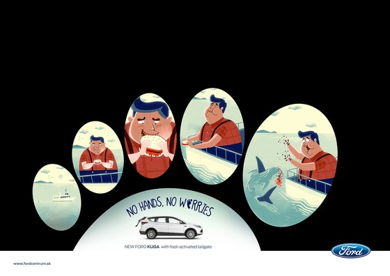 18."No hands, No worries. New Ford Kuga with foot-activated tailgate." (手がなくても大丈夫。新しいフォード・クーガなら、足のスイッチで作動するリアハッチだから。)