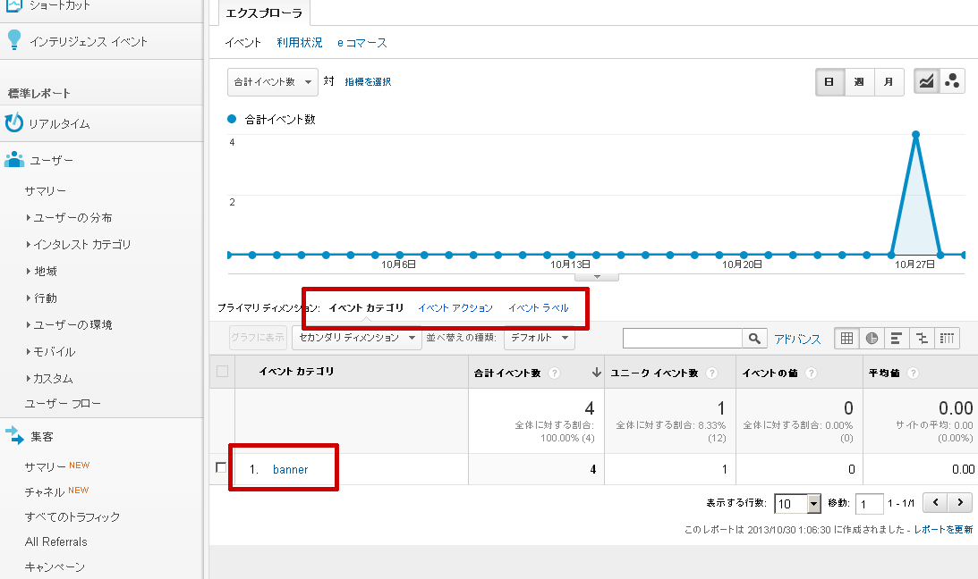 ちなみにGA上ではこの様に表示されます。 確認場所は「レポートの コンテンツ > イベント 上」です。
