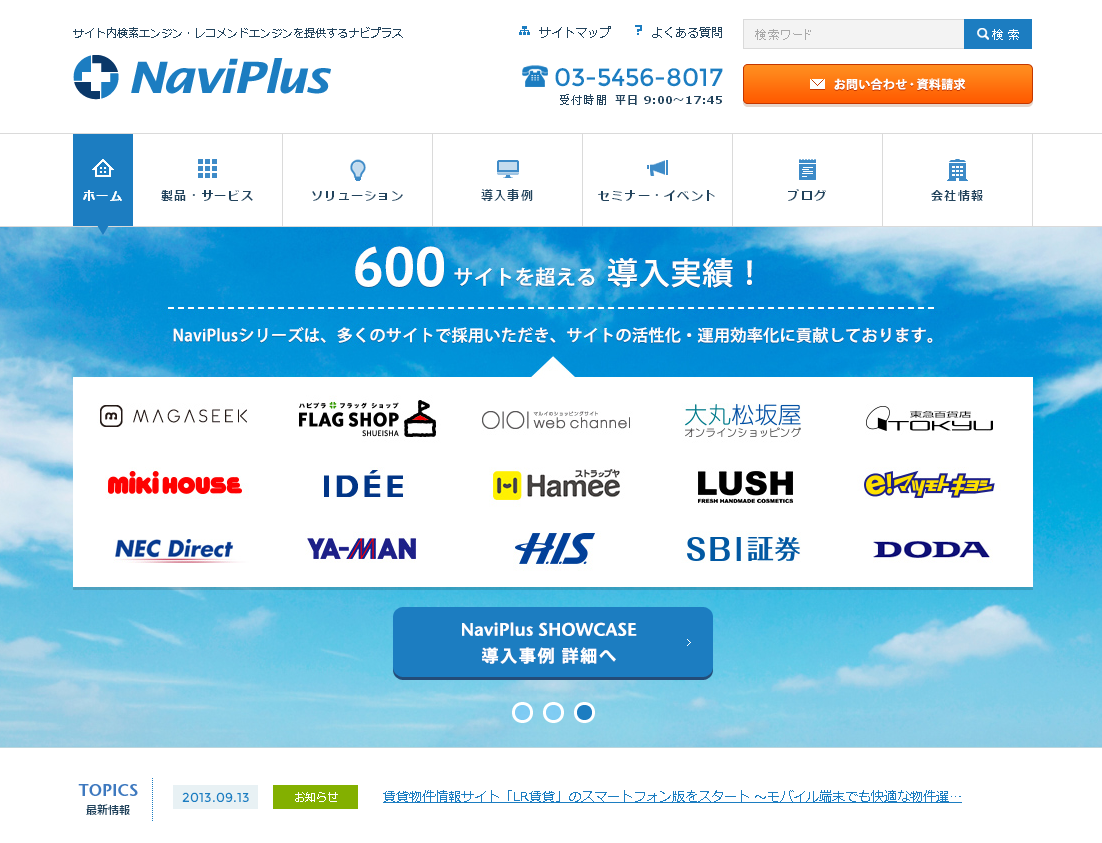 下記のサイトを見るとわかると思いますが、「お問合せ・資料請求」が一番訴求したいポイントで自然なUIに溶け込ませて、使いやすさを演出しております。