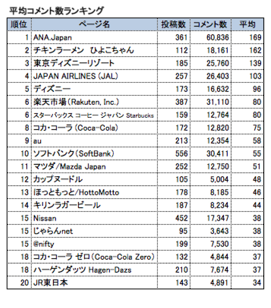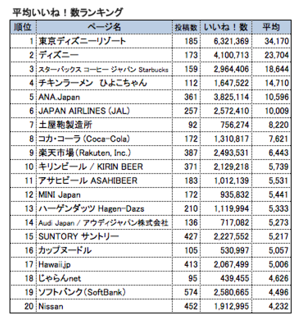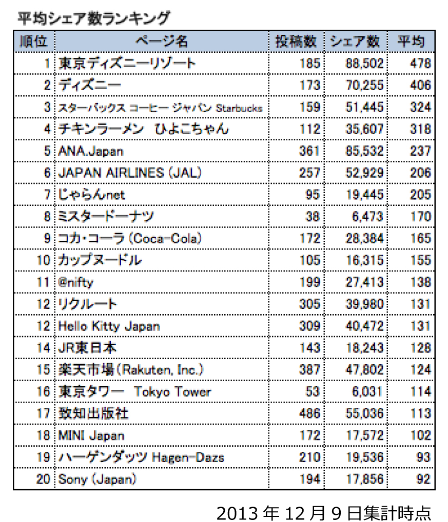 IMJさんから「企業Facebookページ年間ランキング2013」の発表がありました。いやー実際調査レポートを見るとすごいですね〜。東京ディズニーランドにいたっては平均「いいね!」数は3万を超えてるって言うからいやはや、恐るべしディズニーランド。しかし「いいね」数と「コメント数」では「ANA.Japan」が1位となっており決して比例する事はなく、そこに戦略の違いがかいま見れる。 また、「シェア」ランキングでは「おいしそう」「かわいい」「ためになる」など、人に伝えたくなるような、直感的にポジティブな感情を誘発しやすい投稿をしている企業の「スターバックス」「ミスタードーナツ」「ハーゲンダッツ」などが上位にきている事がわかる。